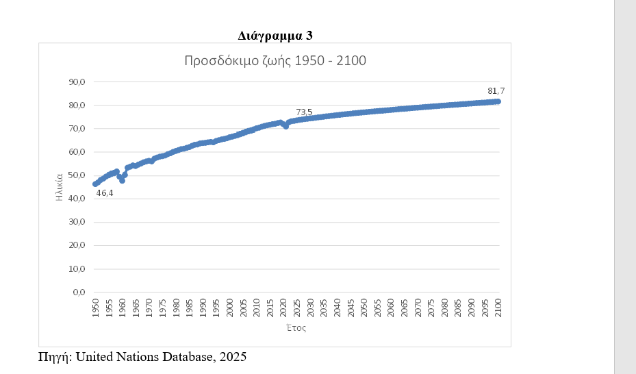 Σε αυτό το περιβάλλον γεννητικότητας, τα Ηνωμένα Έθνη προβλέπουν ταυτόχρονα μια σημαντική μελλοντική επιβράδυνση της αύξησης του προσδόκιμου ζωής. Πράγματι, σύμφωνα με τα στοιχεία των Ηνωμένων Εθνών, το παγκόσμιο προσδόκιμο ζωής τα τελευταία 75 έτη αυξήθηκε κατά 27 έτη από τα 46,4 έτη ηλικίας το 1950 στα 73,3 έτη το 2024, δηλαδή μια μέση αύξηση κατά 3,5 έτη ανά δεκαετία. Ενώ για τα επόμενα 75 έτη (2025 – 2100) προβλέπει ότι το παγκόσμιο προσδόκιμο ζωής θα αυξηθεί από τα 73,3 έτη το 2024 στα 81,7 έτη το 2100, δηλαδή προβλέπεται ότι το μέσο προσδόκιμο ζωής θα αυξάνεται με ένα ρυθμό κατά 1,2 έτη ανά δεκαετία, ρυθμός που αντιστοιχεί στο 1/3 του ρυθμού αύξησης της περιόδου 1950 – 2024 (Διάγραμμα 3).