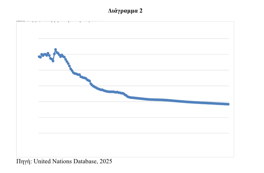 Όπως αποτυπώνεται στο Διάγραμμα 1, ο παγκόσμιος πληθυσμός τα τελευταία 75 (1950 – 2024) χρόνια τριπλασιάστηκε από τα 2,5 δις άτομα το 1950 σε 8,1 δις άτομα το 2024 (αύξηση 5,6 δις ατόμων), ενώ προβλέπεται ότι τα επόμενα 75 έτη θα αυξηθεί μόλις κατά 2 δις άτομα, από τα 8,1 δις το 2024 στα 10,1 δις άτομα το 2100. Αυτή η επιβράδυνση και σταθεροποίηση του παγκόσμιου πληθυσμού οφείλεται στην σημαντική μείωση του δείκτη γονιμότητας από 5,3 παιδιά ανά γυναίκα σε ηλικία αναπαραγωγής το 1960 σε 2,25 παιδιά ανά γυναίκα το 2024 (Διάγραμμα 2).