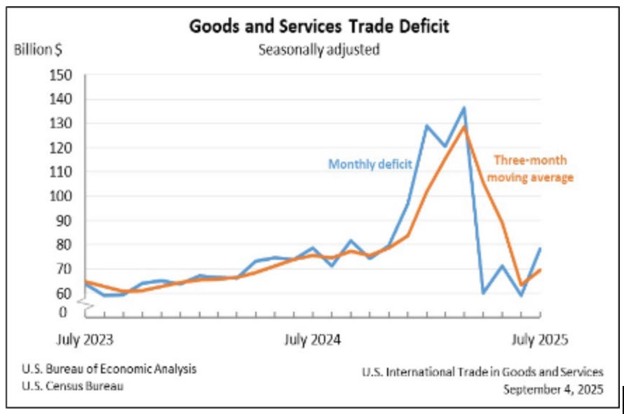 Ας δούμε την εξέλιξη των μεγεθών που αφορούν τους συγκεκριμένους στόχους, στο πρώτο οκτάμηνο του 2025: Το έλλειμμα του εμπορικού ισοζυγίου αγαθών και υπηρεσιών σωρευτικά το πρώτο οκτάμηνο της προεδρίας Τραμπ (-920,102 δισ. $) αυξήθηκε σε σχέση με την αντίστοιχη περίοδο του 2024 (-769,811 δισ. $) και 2023 (-719,452 δισ. $). Αν υπολογίσουμε το έλλειμμα από το μήνα Απρίλιο, όταν ο Τραμπ άρχισε να επιβάλλει δασμούς, τότε τα στοιχεία δείχνουν το εξής: Έτος 2023= 446,5, 2024= 495,572 και 2025=455,068 δισ. $. Παρατηρείται δηλαδή μια (μικρή) μείωση του ελλείμματος εμπορικού ισοζυγίου.
