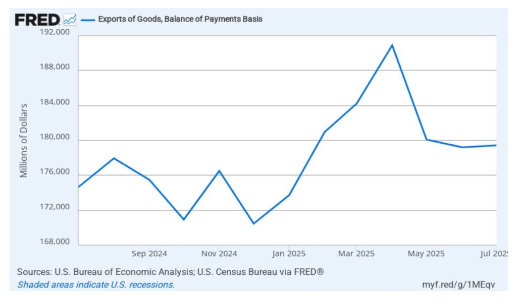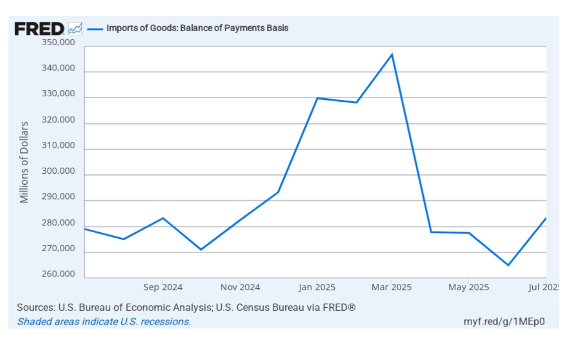 Οι εισαγωγές αγαθών στις ΗΠΑ παρουσιάζονται στο Γράφημα 2. Συνολικά, το πρώτο επτάμηνο οι εισαγωγές αγαθών ανήλθαν σε 2.108,0 δισ. $, αυξημένες έναντι της αντίστοιχης περιόδου του 2024 που είχαν ανέλθει σε 1.889,6 δισ. $. Παρότι, όπως φαίνεται στο Γράφημα 2, οι εισαγωγές παρουσιάζουν μείωση μετά τον Μήνα Απρίλιο 2025, εντούτοις εξακολουθούν και την περίοδο Απριλίου–Ιουλίου 2025, όταν ισχύουν οι δασμοί, να υπερβαίνουν σωρευτικά σε αξία (1.103,4 δισ. $) έναντι της αντίστοιχης περιόδου 2024 (1.094,7 δισ. $).