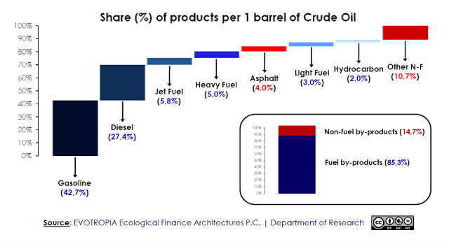 Το 85% ενός βαρελιού αργού πετρελαίου παράγει τις έξι κύριες κατηγορίες καυσίμων και το 15% άλλα πετροχημικά υλικά, όπως άσφαλτος, λιπάσματα, φαρμακευτικά σκευάσματα και πλαστικές ρητίνες
