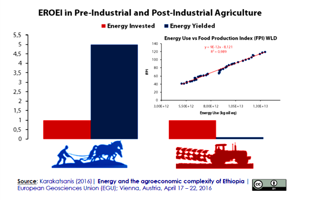 Πριν την Βιομηχανική Επανάσταση, η γεωργία συνιστούσε καθαρό (net) προμηθευτή ενέργειας, ενώ σήμερα έχει μετατραπεί σε καθαρό χρήστη ενέργειας. Συγκεκριμένα, πριν την εισαγωγή γεωργικών μηχανημάτων, η γεωργία απέδιδε πέντε joule για κάθε ηλικιακό joule που δεχόταν, ενώ μετά απέδιδε μόλις 0,1 joule. Επιπρόσθετα, η σημερινή γεωργία έχει ισχυρή εξάρτηση από τα πετροχημικά λιπάσματα.