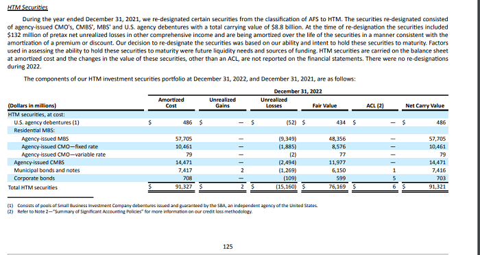 Στις τελευταίες οικονομικές καταστάσεις της SVB για το κλείσιμο του 2022, στη σελίδα 125 των σημειώσεων φαίνεται ότι η μη πραγματοποιηθείσα ζημιά στο χαρτοφυλάκιο των διακρατούμενων έως τη λήξη χρεογράφων (HTM Securities) έφτανε τα $15,16 δισ.