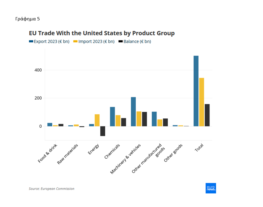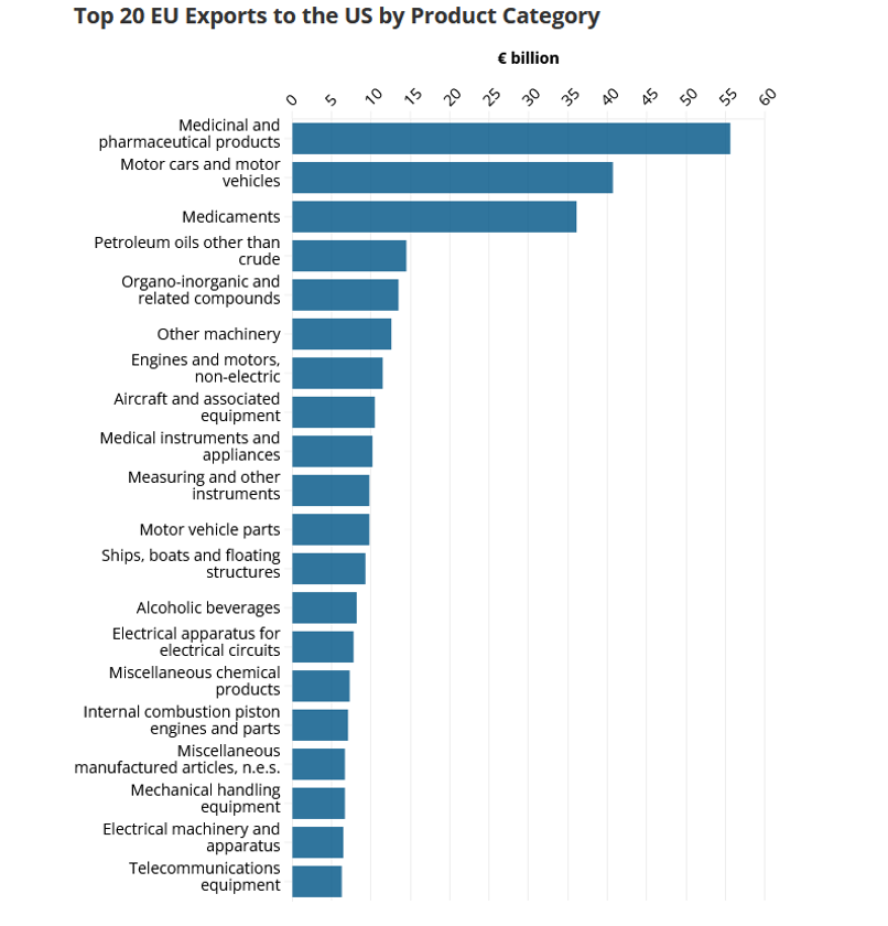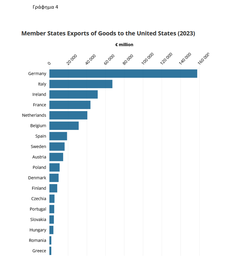 Τομείς όπως τα μηχανήματα, τα οχήματα και τα χημικά – που μαζί αποτελούσαν το 68% των εξαγωγών της ΕΕ στις ΗΠΑ πέρυσι – θα πληγούν περισσότερο. Θα έκανε τη Γερμανία, την οικονομική δύναμη του ευρωπαϊκού μπλοκ, ιδιαίτερα ευάλωτη σε κραδασμούς, δεδομένης της εξάρτησής της από τις εξαγωγές των ΗΠΑ σε αυτούς τους τομείς (αλλά και η Ιταλία).