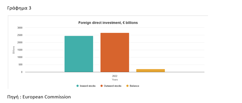Οι άμεσες επενδύσεις των ΗΠΑ στην ΕΕ οδηγούνται από μη τραπεζικές εταιρείες χαρτοφυλακίου, τη μεταποίηση και τη χρηματοδότηση και την ασφάλιση. Οι ΑΞΕ της ΕΕ στις ΗΠΑ (απόθεμα) ήταν 2,4 τρισεκατομμύρια δολάρια το 2022, αυξημένες κατά 4,0 % από το 2021. Οι άμεσες επενδύσεις της Ευρωπαϊκής Ένωσης στις Ηνωμένες Πολιτείες κατευθύνονται από τη μεταποίηση, τη χρηματοδότηση και τις ασφάλειες και το χονδρικό εμπόριο. Για το 2023 δεν υπάρχουν σημαντικές διαφοροποιήσεις, όπως συνεπάγεται από τα Γραφήματα 1,2,3 που ακολουθούν: