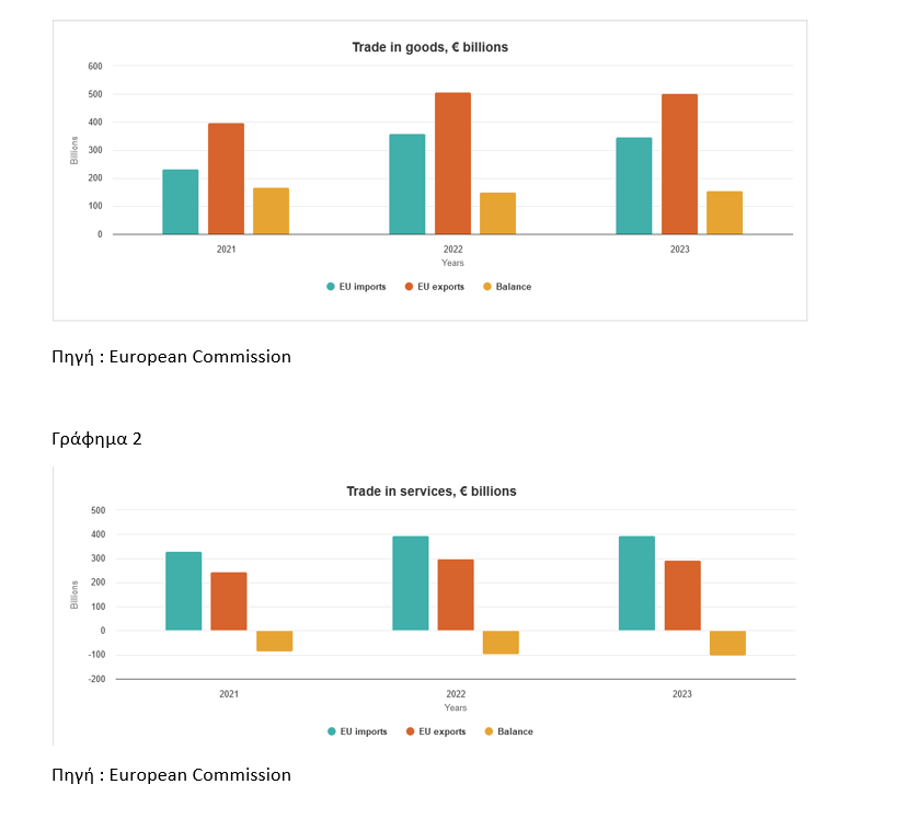 Σύνοψη Εμπορίου και Επενδύσεων της EE με τις ΗΠΑ: Το εμπόριο αγαθών και υπηρεσιών των ΗΠΑ με την ΕΕ ανήλθε συνολικά σε 1,3 τρισεκατομμύρια δολάρια το 2022. Οι εξαγωγές ήταν 592,0 δισεκατομμύρια δολάρια. Οι εισαγωγές ήταν 723,3 δισεκατομμύρια δολάρια. Το εμπορικό έλλειμμα αγαθών και υπηρεσιών των ΗΠΑ με την Ευρωπαϊκή Ένωση ήταν 131,3 δισεκατομμύρια δολάρια το 2022.