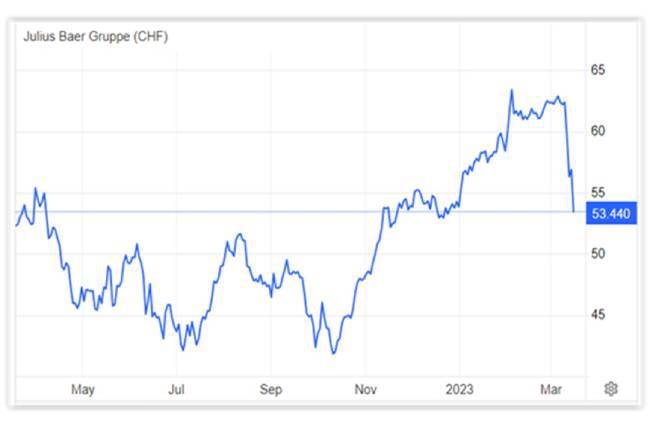 Η 5η μεγαλύτερη ελβετική τράπεζα είναι ο όμιλος Julius Baer. Ιδρύθηκε το 1890 με έδρα τη Ζυρίχη. Δείτε την 12μηνη διακύμανση της μετοχής της και συγκρίνετέ την με αυτήν της Credit Suisse.