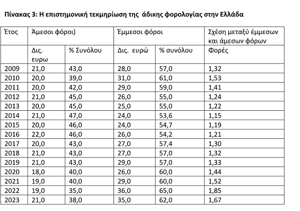 - Μετά το 2001, το ρεκόρ υψηλότερης σχέσης (φορές) μεταξύ των άδικων και αντικοινωνικών έμμεσων και άμεσων φόρων πέτυχε η σημερινή κυβέρνηση της ΝΔ το 2022 (1,85 φορές), καταρρίπτοντας το προηγούμενο ρεκόρ (1,59 φορές) του 2014!