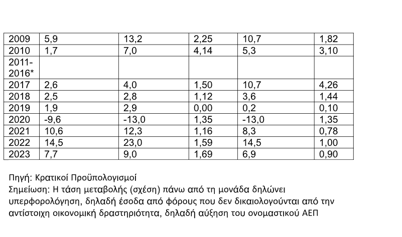 Σημειώνεται ότι, με εξαίρεση το 1993, το 1994, το 2001 και το 2005, η τάση αυτή είναι πάνω από τη μονάδα! Την περίοδο αυτή (με εξαίρεση εκείνη της κρίσης, όταν η μεταβολή του ΑΕΠ ήταν αρνητική), το ρεκόρ φορομπηχτισμού κατέχει η κυβέρνηση του ΠΑΣΟΚ το 2010, όταν τα φορολογικά έσοδα ήταν 4,14 φορές πάνω από το ΑΕΠ, καταρρίπτοντας το προηγούμενο ρεκόρ του 2009 (2,25 φορές)!