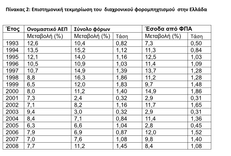 - Η επιστημονική τεκμηρίωση της αβάσταχτης υπερφορολόγησης τα τελευταία 30 χρόνια προκύπτει από τη σχέση μεταξύ της μεταβολής του ονομαστικού ΑΕΠ και της μεταβολής των συνολικών φόρων και ΦΠΑ. Όταν η σχέση αυτή είναι πάνω από τη μονάδα, τα αντίστοιχα φορολογικά υπερέσοδα δεν δικαιολογούνται, δηλαδή είναι φορομπηχτικά.