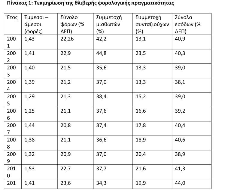 Οι παρατιθέμενοι δύο πίνακες (στο τέλος του κειμένου), που στηρίζονται σε δική μου επεξεργασία των φορολογικών στοιχείων της ΕΛΣΤΑΤ, επιβεβαιώνουν διαχρονικά διαπιστώσεις εκθέσεων της Τράπεζας της Ελλάδος, διεθνών οργανισμών (Ευρωπαϊκή Επιτροπή, Eurostat, ΟΟΣΑ, ΔΝΤ, Παγκόσμια Τράπεζα), αλλά και ντόπιων ερευνητικών ιδρυμάτων (Ίδρυμα Οικονομικών και Βιομηχανικών Ερευνών, Κέντρο Φιλελεύθερων Μελετών κλπ) για το άδικο, διαχρονικά, αντιαναπτυξιακό, αντιδημογραφικό και αναποτελεσματικό ελληνικό φορολογικό σύστημα. Δικαιώνουν τις προτάσεις τους για την προώθηση πραγματικών μεταρρυθμίσεων, ώστε να συγκλίνουν προς την ΕΕ και την Ευρωζώνη και η φορολογική διοίκηση και η φορολογική διαχείριση, αλλά ματαίως…