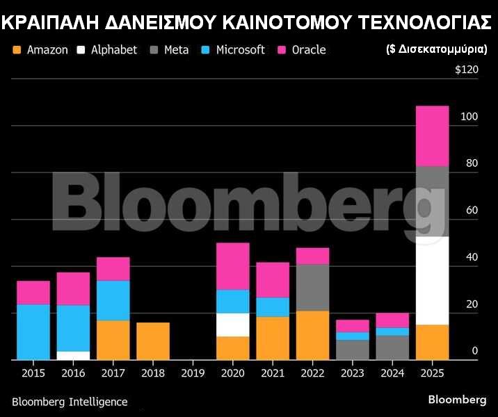 Οι μεγάλοι όμιλοι, όπως της ALPHABET, της META και της ORACLE, υπερδανείζονται, με εκδόσεις τίτλων χρέους ύψους $75 δισεκατομμυρίων στο δίμηνο Σεπτεμβρίου-Οκτωβρίου του 2025, μέγεθος μεγαλύτερο από το διπλάσιο του ετήσιου μέσου όρου δανεισμού τους από το 2015 έως το 2024. Τα υπερσύγχρονα κέντρα δεδομένων του τομέα έχουν δανεισμό με εγγυήσεις στοιχείων του ενεργητικού τους και αντίστοιχο ενυπόθηκο (εξοπλισμός-μικροεπεξεργαστές) ύψους $49 δισεκατομμυρίων, με την MORGAN STANLEY να υπολογίζει πως τα κέντρα δεδομένων Τεχνητής Νοημοσύνης (ΑΙ) θα προχωρήσουν στην περίοδο 2025-2028 σε δαπάνες ύψους $2,9 τρισεκατομμυρίων, με το 50% να απαιτείται να προέλθει από εξωτερική χρηματοδότηση.