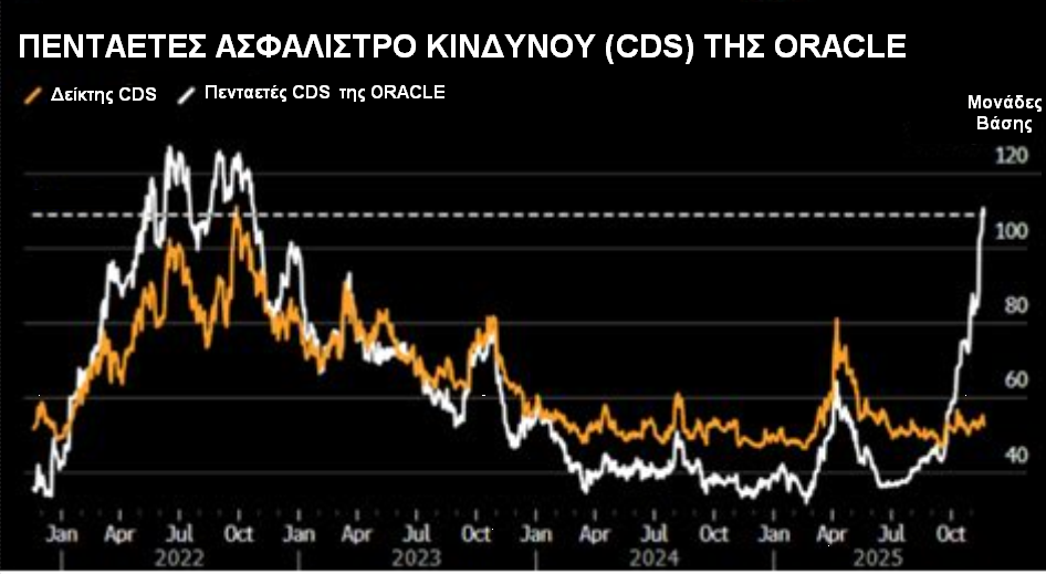 Η ORACLE διπλασιάζει σε μία δεκαετία τον έντοκο δανεισμό της στα $111,6 δισεκατομμύρια, με την τράπεζα BARCLAYS να υποβαθμίζει το αξιόχρεο της εταιρείας, με ταυτόχρονη σύσταση ρευστοποίησης των δανειακών της τίτλων. Οι εξελίξεις προκαλούν ανησυχία στους επενδυτές, με το πενταετές ασφάλιστρο κινδύνου (CDS) της εταιρείας να εκτοξεύεται στο 100 από το 55 των αρχών του έτους, εμφανίζοντας την μεγαλύτερη απότομη άνοδο από τα τέλη του 2023. Η ευρύτερη πάντως αύξηση των ασφαλίστρων κινδύνου (CDS) του τομέα πιστοποιεί πως οι επενδυτές εμφανίζονται διατεθειμένοι να αποδεχθούν μεγαλύτερο κόστος για να προστατευθούν από ενδεχόμενες στάσεις πληρωμών.