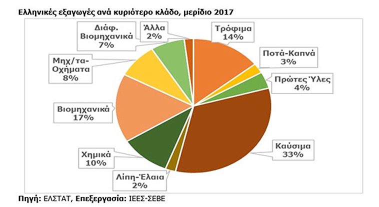 Την περίοδο Ιανουαρίου-Ιουνίου 2017, οι ελληνικές εξαγωγές αγαθών, ανήλθαν στο ποσό των 14.187,8 εκατ. ευρώ έναντι 12.006,4 εκατ. ευρώ κατά το ίδιο διάστημα 2016, παρουσιάζοντας αύξηση 18,2% . Αν όμως αφαιρέσουμε την αξία των πετρελαιοειδών και των πλοίων η αντίστοιχη μεταβολή παρουσίασε αύξηση κατά 704,6 εκατ. ευρώ, δηλαδή 7,8%.