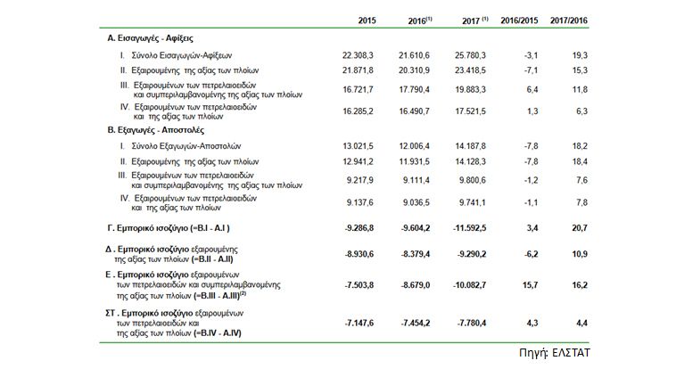 Οι εισαγωγές αγαθών το α’ εξάμηνο 2017 ανήλθαν στο ποσό των 25.780,3 εκατ. ευρώ έναντι 21.610,6 εκατ. ευρώ το αντίστοιχο διάστημα του έτους 2016, παρουσιάζοντας αύξηση κατά 19,3%. Αν όμως αφαιρέσουμε την αξία των πετρελαιοειδών και των πλοίων η αντίστοιχη μεταβολή παρουσίασε αύξηση κατά 1.120,8 εκατ. ευρώ, δηλαδή 6,3%.