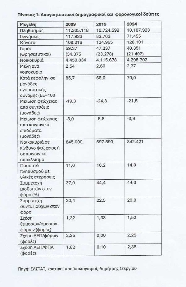 Αλλά, πέρα από τις διαπιστώσεις της έκθεσης του ΟΟΣΑ για τη φορολογική σκληρότητα, το άδικο αντιαναπτυξιακό, αναποτελεσματικό και αντικοινωνικό φορολογικό σύστημα, τα πρωτο-μαγιάτικα λόγια του Μητσοτάκη γίνονται πτερόεντα και από τον παρατιθέμενο πίνακα που κατάρτισα με βάση επίσημα στοιχεία και που είναι τόσο εύγλωττα που κάνουν περιττή την περιγραφική γλώττα. Απλώς, προτείνω να προσέξετε ιδιαίτερα τα στοιχεία για την εφιαλτική δημογραφική εξέλιξη από το 2009, αλλά και το 2019 έως σήμερα, τη φτώχεια, την ανισότητα και τη φορολογία.