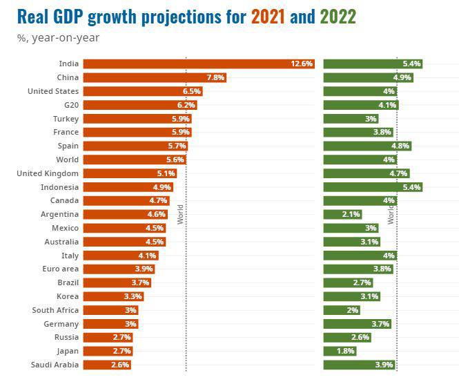 Φως στο τούνελ διαβλέπει ο Οργανισμός Οικονομικής Συνεργασίας και Ανάπτυξης, σύμφωνα με την ενδιάμεση έκθεση οικονομικής προοπτικής που έδωσε στη δημοσιότητα στις 9 Μαρτίου, για τις 20 ισχυρότερες οικονομικά χώρες του κόσμου (G20). Η παγκόσμια οικονομία αναμένεται να σημειώσει ανάπτυξη κατά 5,6% το 2021, ήτοι 1,4 ποσοστιαίες μονάδες παραπάνω από την προηγούμενη πρόβλεψη, κάτι που αποδίδεται κυρίως στο πρόγραμμα εμβολιασμών και το φιλόδοξο πακέτο στήριξης της αμερικανικής οικονομίας.