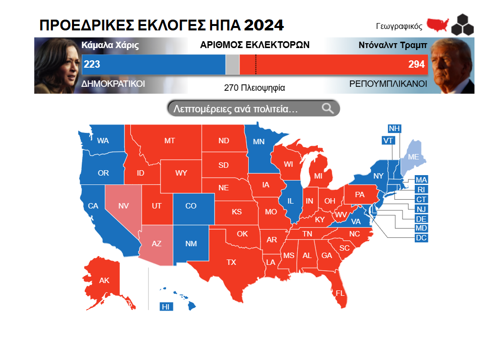 Με τη νίκη του και στο Μίσιγκαν, ύστερα από την Πενσιλβάνια και το Ουισκόνσιν, ο Τραμπ κέρδισε τις τρεις πολιτείες-κλειδιά στο βόρειο τμήμα της χώρας – όπου η Χάρις εμφανιζόταν προεκλογικά ως φαβορί. Έχει μέχρι στιγμής 294 Εκλέκτορες. Σύμφωνα με τα αμερικανικά ΜΜΕ, ο Τραμπ επικρατεί σε Αλαμπάμα, Αρκάνσας, Φλόριντα, Ιντιάνα, Κεντάκι, Λουιζιάνα, Μιζούρι, Μισισίπι, Μοντάνα, Βόρεια Ντακότα, Οχάιο, Οκλαχόμα, Νότια και Βόρεια Καρολίνα, Νότια Ντακότα, Τενεσί, Τέξας, Γιούτα, Δυτική Βιρτζίνια, Γουαϊόμινγκ, Κάνσας, Αϊντάχο, Αϊόβα, Τζόρτζια και Πενσιλβάνια.