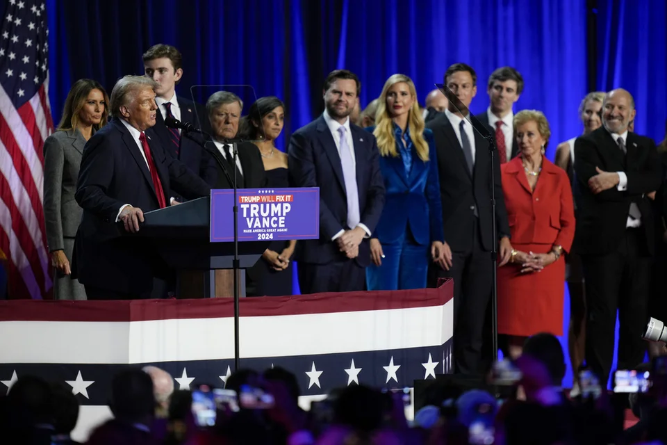 Τις πρώτες του δηλώσεις έκανε ο Τραμπ, έχοντας δίπλα του την σύζυγό του Μελάνια, την οποία και ευχαρίστησε. Ο Τραμπ κατευθύνθηκε στο Παλμ Μπιτς, και απευθύνθηκε στους συγκεντρωμένους οπαδούς του. «Σας ευχαριστώ πολύ όλους. Θα βοηθήσουμε τη χώρα να θεραπευτεί, θα διορθώσουμε τα πράγματα. Γράψαμε Ιστορία, ξεπεράσαμε εμπόδια, καταφέραμε την πιο σπουδαία πολιτική κίνηση. Είναι μια πολιτική νίκη, ευχαριστώ τους Αμερικανούς για την τιμή, είμαι ο 47ος πρόεδρος των ΗΠΑ, θα αγωνιστώ για εσάς και τις οικογένειές σας, κάθε μέρα θα αγωνίζομαι για εσάς. Αυτή θα είναι η χρυσή εποχή της Αμερικής. Είναι μια υπέροχη νίκη για τους Αμερικανούς. Κερδίσαμε και τη λαϊκή ψήφο, ήταν πολύ σημαντικό. Ψηφίσατε μία ομάδα ανθρώπων, πέρα από τον πρόεδρο. Κερδίσαμε πίσω τον έλεγχο της Γερουσίας».