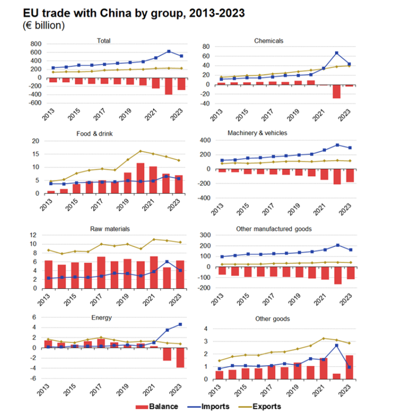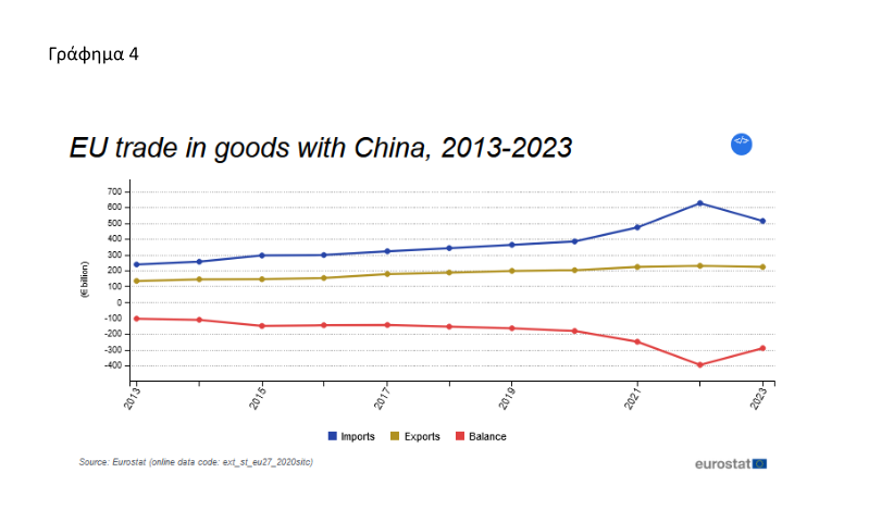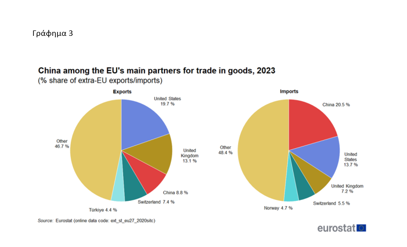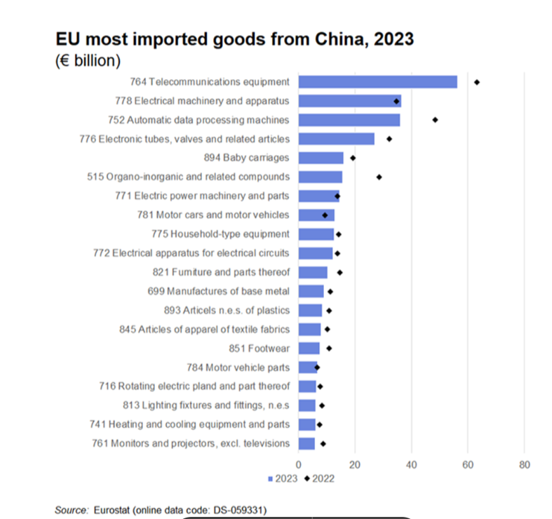 Εν τω μεταξύ, η ευρωπαϊκή βιομηχανία εξαρτάται όλο και περισσότερο από κινεζικά κεφαλαιουχικά αγαθά. Σύμφωνα με τη Eurostat, (Γράφημα 1) στις πρώτες θέσεις των εισαγομένων προϊόντων από την Κίνα, βρίσκονται: Ο τηλεπικοινωνιακός εξοπλισμός (2023: 56,3 δισεκατομμύρια ευρώ), τα ηλεκτρικά μηχανήματα και συσκευές (36,5 δισεκατομμύρια ευρώ το 2023) και οι αυτόματες μηχανές επεξεργασίας δεδομένων (36 δισεκατομμύρια ευρώ το 2023).