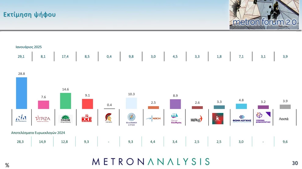 Πρώτη με διαφορά 14 μονάδων από το ΠΑΣΟΚ παραμένει η ΝΔ σύμφωνα με δημοσκόπηση της Metron Analysis. Η Πλεύση Ελευθερίας της Ζωής Κωνσταντοπούλου κάνει την ανατροπή και περνά πάνω από τον ΣΥΡΙΖΑ, ενώ το Κίνημα Δημοκρατίας του Στέφανου Κασσελάκη εμφανίζεται να μπαίνει οριακά στη Βουλή.