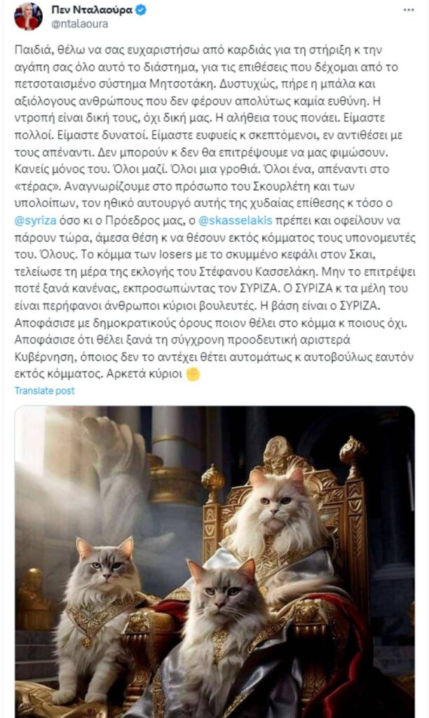 Συγκεκριμένα ο λογαριασμός «Πεν Νταλαούρα» μιλά για απόπειρα φίμωσης λέγοντας πως «είμαστε όλοι μία γροθιά», ενώ ρίχνει βέλη στον Πάνο Σκουρλέτη γράφοντας χαρακτηριστικά «αναγνωρίζουμε στο πρόσωπο του Σκουρλέτη και των υπολοίπων, τον ηθικό αυτουργό αυτής της χυδαίας επίθεσης κ τόσο ο ΣΥΡΙΖΑ όσο κι ο Πρόεδρος μας, ο Στέφανος Κασσελάκης πρέπει και οφείλουν να πάρουν τώρα, άμεσα θέση κ να θέσουν εκτός κόμματος τους υπονομευτές του. Όλους».