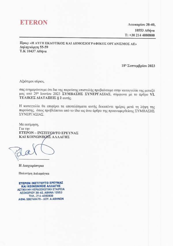Τα πράγματα όμως φαίνεται δεν ήλθαν, όπως αρχικά κάποιοι είχαν υπολογίσει. Στις 18 Σεπτεμβρίου, μία ημέρα μετά τον πρώτο γύρο των εσωκομματικών εκλογών στον ΣΥΡΙΖΑ και ενώ είχε επικρατήσει ο Στέφανος Κασσελάκης έναντι της Έφης Αχτσιόγλου, παίρνοντας σαφές προβάδισμα για την ηγεσία, το ETERON ακύρωσε μονομερώς τη συμφωνία. Στο σχετικό έγγραφο, δεν υπάρχει κάποια αιτιολογία, παρά μόνον η επίκληση του σχετικού άρθρου της αρχικής συμφωνίας, που προβλέπει ότι το Ινστιτούτο μπορεί να καταγγείλει μονομερώς τη σύμβαση.