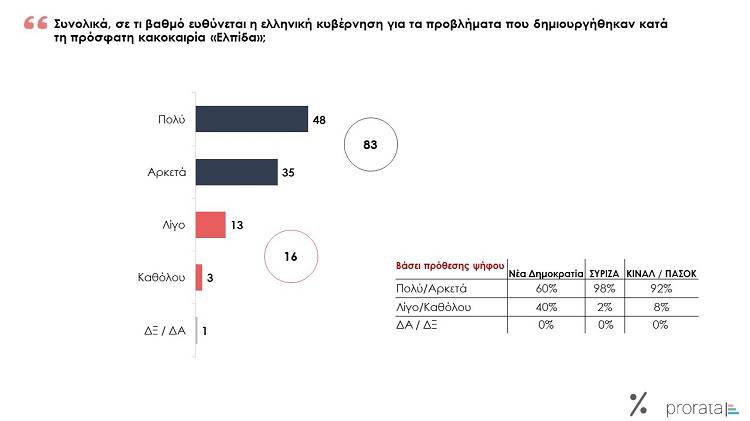 Η αξιολόγηση του κοινού για την διαχείριση της κακοκαιρίας “Ελπίς” αποτυπώνει σημαντική κοινωνική δυσαρέσκεια. Πιο συγκεκριμένα, το 83% εκτιμάει ότι για τα προβλήματα που δημιουργήθηκαν ευθύνεται σε σημαντικό βαθμό η κυβέρνηση, ενώ μικρή ή μηδενική ευθύνη της αποδίδει μόλις το 16%.