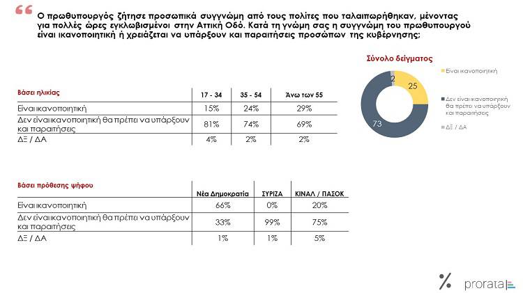 Παράλληλα, σύμφωνα με τα ευρήματα που αφορούν την διαχείριση της κακοκαιρίας “Ελπίς”, περίπου 3 στους 4 διατηρούν την άποψη ότι η προσωπική συγγνώμη του πρωθυπουργού για τους πολίτες που ταλαιπωρήθηκαν, μένοντας για πολλές ώρες εγκλωβισμένοι στην Αττική Οδό, δεν ήταν ικανοποιητική και θα έπρεπε να υπάρξουν και σχετικές παραιτήσεις.