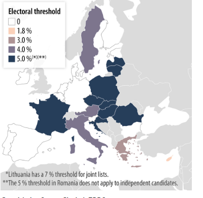 Όσον αφορά στα μικρά κόμματα, η Ελλάδα και η Κύπρος είχαν από τα μικρότερα “κατώφλια” (3% και 1,8% αντίστοιχα) ενώ άλλες χώρες, όπως η Γαλλία, η Τσεχία, η Λιθουανία, η Κροατία, η Ουγγαρία, η Λετονία, η Πολωνία, η Ρουμανία και η Σλοβακία είχαν υψηλότερα (5%). Η Ιταλία, η Αυστρία και η Σουηδία είχαν στόχο το 4%. Οι υπόλοιπες χώρες δεν είχαν περιορισμό.