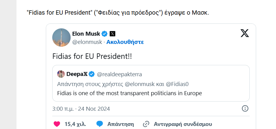 Νωρίτερα, η σχέση που διατηρεί με τον Αμερικανό δισεκατομμυριούχο και στενό (μέχρι πρότινος σύμμαχο του Ντόναλντ Τραμπ) Έλον Μασκ, έκανε το Politico να μιλάει για «τον άνθρωπο του Έλον Μασκ στο Ευρωπαϊκό Κοινοβούλιο» σε εκτενές του αφιέρωμα. Ο λόγος έχει να κάνει με κοινό σκεπτικισμό των δύο ανδρών προς τις Βρυξέλλες, με τον ιδιαίτερα επιδραστικό στα social media μεγιστάνα να αναδημοσιεύει τακτικά αναρτήσεις του Φειδία.