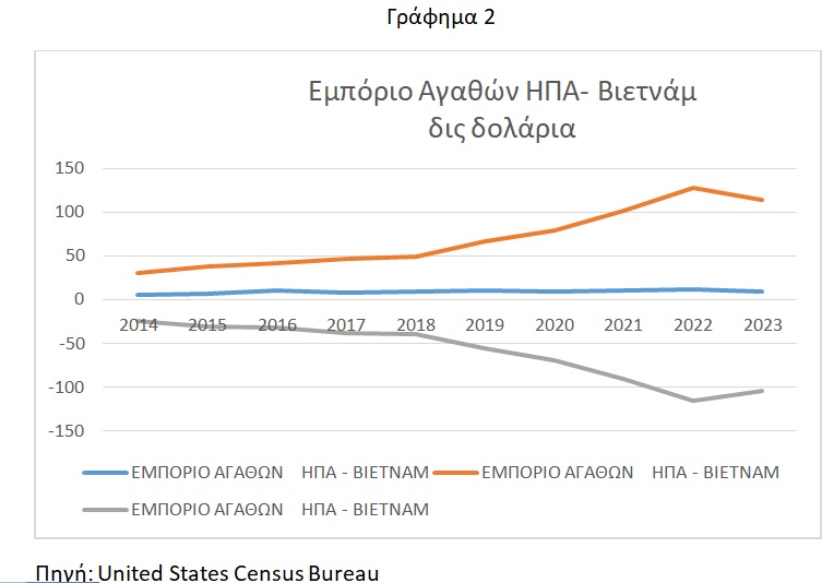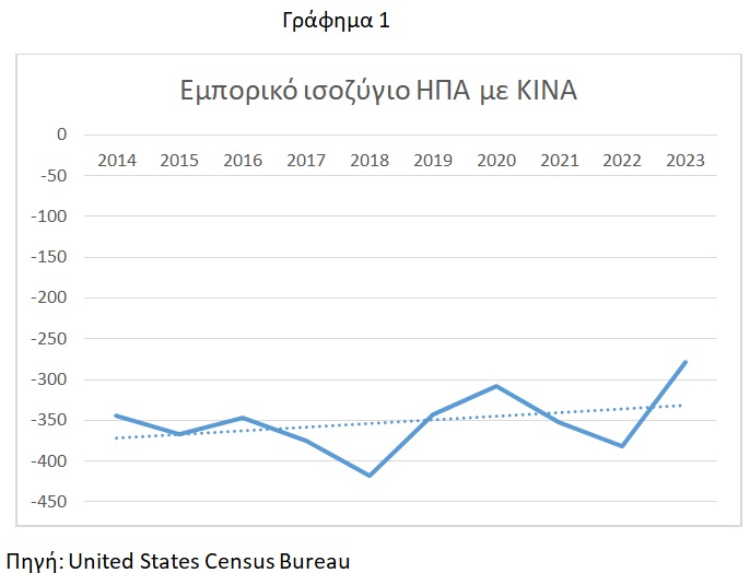 Αξίζει να θυμηθούμε ότι, παρά τις πολυάριθμες πρωτοβουλίες δασμών, το εμπορικό έλλειμμα (αγαθών) των ΗΠΑ δεν μειώθηκε καθόλου τα τελευταία χρόνια: Το 2016 ήταν 735 δισεκατομμύρια δολάρια, το 2021 ήταν 1,070 δισεκατομμύρια δολάρια και το 2023 1,063 αντίστοιχα. Σε σχέση με την Κίνα υπάρχει μια τάση μείωση του εμπορικού ελλείμματος (αγαθών) την τελευταία δεκαετία (δες Γράφημα 1).