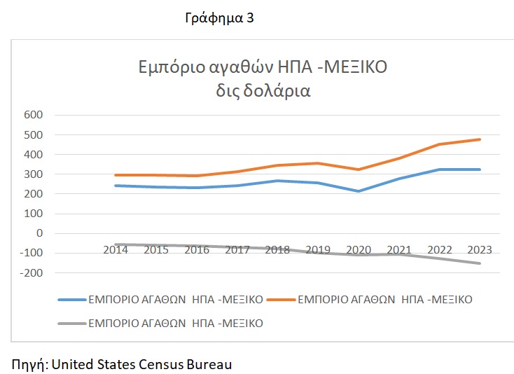 Στην πραγματικότητα, η όποια μείωση του ελλείμματος έναντι της Κίνας υπεραντισταθμίστηκε από την αύξηση του σε άλλες χώρες, όπως το Μεξικό και το Βιετνάμ, χωρίς να μειωθεί η εξάρτηση των ΗΠΑ από τις αλυσίδες εφοδιασμού που συνδέονται με την Κίνα. Στο Γράφημα 2 παρουσιάζεται η εξέλιξη του εμπορίου αγαθών μεταξύ ΗΠΑ και Βιετνάμ. Από την ημερομηνία επιβολής δασμών στην Κίνα οι εξαγωγές από το Βιετνάμ αυξάνονται συνεχώς και το έλλειμμα ξεπερνά τα 100 δισ. δολάρια το 2023. Το ίδιο ακριβώς συμβαίνει και με το εμπορικό έλλειμμα των ΗΠΑ με το Μεξικό, όπως παρουσιάζεται στο Γράφημα 3.