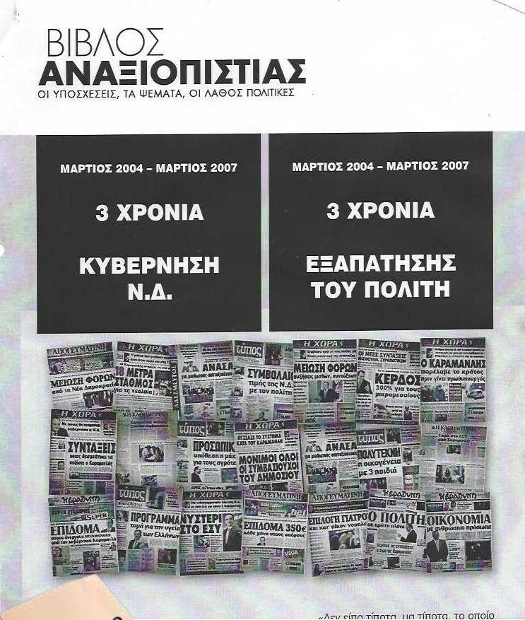 Ύστερα ακριβώς από ένα χρόνο, στις 4 Μαρτίου του 2007, το ΠΑΣΟΚ κυκλοφόρησε τη δεύτερη “Μαύρη Βίβλο” (βλέπε φωτογραφία) με τίτλο “Βίβλος Αναξιοπιστίας, οι υποσχέσεις, τα ψέματα, οι λάθος πολιτικές” 22 σελίδων, στις οποίες παρουσιάζονται “πώς εξαπάτησε η Νέα Δημοκρατία” όλους ανά θέμα Νέα γενιά, Γυναίκα, φορολογούμενοι, μισθωτοί κλπ, με εισαγωγή του τότε προέδρου του, Γιώργου Παπανδρέου, η οποία αρχίζει ως εξής: