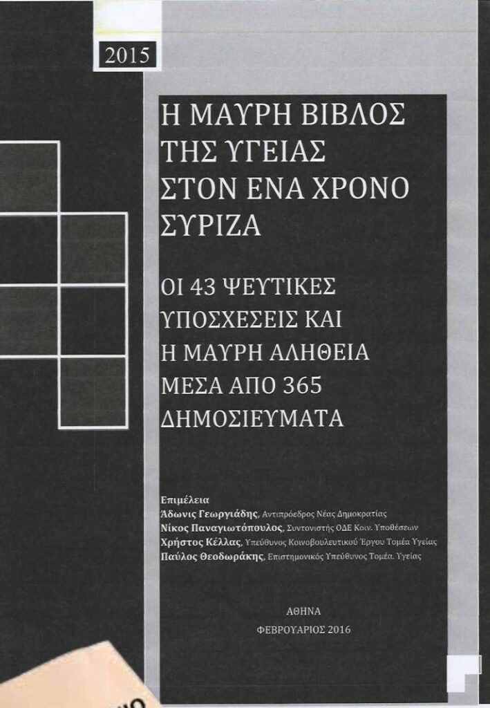 Και όπως λέει ο θυμόσοφος ελληνικός λαός για τη “γίδα που τρώει το πουρνάρι και τα τραβάει το τομάρι”, τον Φεβρουάριο του 2016, η ΝΔ με επιμέλεια του τότε αντιπροέδρου του κόμματος, Αδώνιδος Γεωργιάδη, (σήμερα είναι υπουργός Υγείας!), του Νίκου Παναγιωτόπουλου, συντονιστή τότε του ΟΔΕ Κοινωνικών Υποθέσεων, του Χρήστου Κέλλα, υπεύθυνου κοινοβουλευτικού έργου Τομέα Υγείας και Παύλου Θεοδωράκη, επιστημονικού υπεύθυνου Τομέα Υγείας, κυκλοφόρησε (βλέπε φωτογραφία) τη “Μαύρη Βίβλο της Υγείας στον έναν χρόνο ΣΥΡΙΖΑ”, παρουσιάζοντας τις “43 ψεύτικες υποσχέσεις και τη μαύρη αλήθεια μέσα από 365 δημοσιεύματα”. Και εις άλλα με… υγείαν…