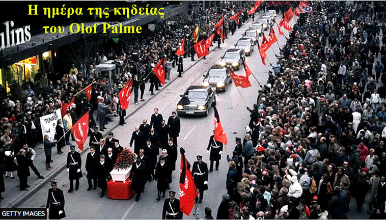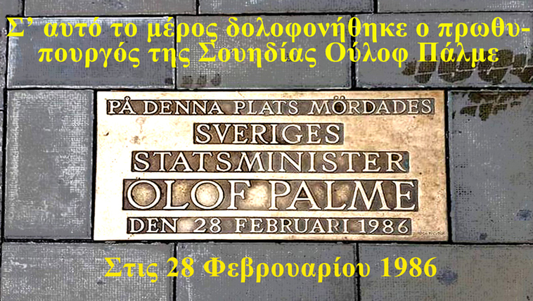 Όταν βγήκαν από τον κινηματογράφο “GRAND”, η Στοκχόλμη ήταν χιονισμένη και το κρύο τσουχτερό. Όπως και άλλες φορές, έτσι και εκείνο το βράδυ, ο Πάλμε είχε ζητήσει από τους αστυνομικούς να μην τον συνοδεύσουν! Το πρωθυπουργικό ζευγάρι διάλεξε να διασχίσει περπατώντας το κέντρο της Στοκχόλμης για το σπίτι, στην παλιά συνοικία GAMLA STAN. Οι δρόμοι ήταν σχεδόν έρημοι. Λίγο πιο πέρα τους περίμενε ο δολοφόνος. Την παγερή ησυχία της νύχτας διέκοψαν δύο πυροβολισμοί. Ο Ούλοφ Πάλμε έπεσε αιμόφυρτος στο πεζοδρόμιο, ενώ ο δολοφόνος χάθηκε τρέχοντας στο σκοτάδι. Ο άνθρωπος που υπηρέτησε με όλες τις δυνάμεις του την ειρήνη, ο άνθρωπος που είχε γίνει θρύλος όταν ακόμα ζούσε, ήταν νεκρός!