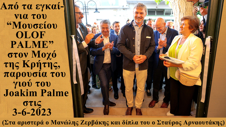 Η Κρήτη ήταν δημοφιλής προορισμός της οικογένειας Πάλμε. Τιμώντας την μνήμη του ο “Σύλλογος Φίλων ΟΥΛΟΦ ΠΑΛΜΕ” και οι κάτοικοι στο χωριό Μοχός, σε συνεργασία με την Τ/Α και την Περιφέρεια Κρήτης ίδρυσαν ένα μοναδικό στον κόσμο Μουσείο με το όνομα OLOF PALME. Πρωτεργάτες ο Μανώλης Ζερβάκης, η Ελένη Φαρσαράκη και ο Γιάννης Μαρκάκης, Διευθυντής Μουσείου Παραδοσιακής Ζωής Κρήτης “ΛΥΧΝΟΣΤΑΤΗΣ”. Σημαντική η βοήθεια από τον Περιφερειάρχη Σταύρο Αρναουτάκη. Στα εγκαίνια του Μουσείου στις 3.6.2023 παρευρέθηκε και ο Joakim Palme, γιος του Πάλμε.
