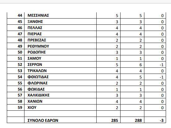 Με βάση την τελευταία κατανομή εδρών, όπως διαμορφώθηκε με το Προεδρικό Διάταγμα 117/2018 – ΦΕΚ 225/Α/31-12-2018, δύο έδρες κερδίζει η εκλογική Περιφέρεια της Ανατολικής Αττικής ενώ από μία έδρα κερδίζουν ο Βόρειος, ο Δυτικός και ο Νότιος τομέας Αθηνών καθώς και η Α΄ εκλογική Περιφέρεια της Θεσσαλονίκης. Αντίθετα, από μία έδρα χάνουν οι εκλογικές Περιφέρειες Α΄ Αθηνών, Α΄ Πειραιώς, Άρτας, Κοζάνης, Μαγνησίας, Σερρών, Φθιώτιδας, Θεσπρωτίας και Καστοριάς. Μάλιστα οι δύο τελευταίες Περιφέρειες καθίστανται μονοεδρικές.
