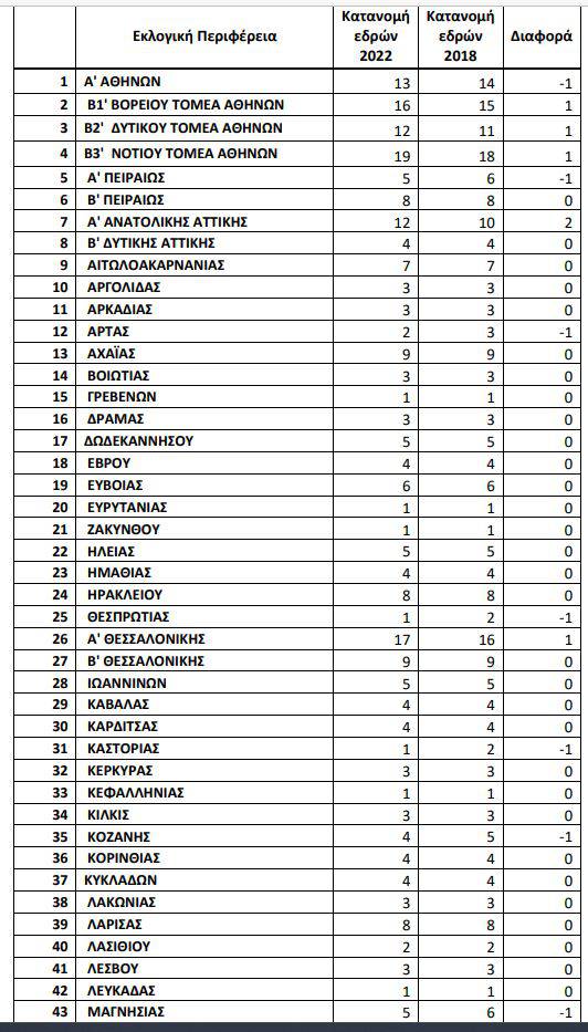 Στην κατανομή αυτή ενσωματώνεται και η επίπτωση από τις τρεις έδρες που αφαιρούνται από τις εκλογικές περιφέρειες για να προστεθούν στο ψηφοδέλτιο Επικρατείας, προκειμένου να εκπροσωπηθούν οι κάτοικοι εξωτερικού. Σημειώνεται ότι ο υπουργός Εσωτερικών Μάκης Βορίδης έδωσε εντολή στη Διεύθυνση Εκλογών του Υπουργείου να προχωρήσει στη σύνταξη σχετικού Προεδρικού Διατάγματος που θα αποτυπώνει τις παραπάνω μεταβολές και το οποίο πρόκειται να εκδοθεί έως τις 10 Ιανουαρίου του 2023. Ακολουθεί ο πίνακας με την κατανομή των εδρών.