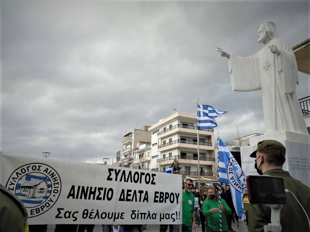 Υπήρξαν πράγματι συνθήματα πολλά εκ των οποίων έντονα: «Ότι και να μας φέρνετε την γη μας δεν την παίρνετε», «Αθήνα πουλημένη ο Έβρος δεν πεθαίνει», «Αλήτες, προδότες, πολιτικοί», «Χαιρετίσματα λοιπόν στην εξουσία», «Πάρτον Πέτσα σου και μπρος δεν σε θέλει ο λαός», «Έξω οι λάθρο από την Ελλάδα», «Τον Μάρτιο του 2020 ποιος έδινε την μάχη, εμείς οι καλυβιέρηδες με τους αγρότες δίπλα, μη κάνετε το λάθος, τον Έβρο να ακουμπήσετε για το θα το πληρώσετε με αίμα και με δάκρυ». Οι διαδηλωτές έψαλλαν δυνατά τον εθνικό ύμνο προκαλώντας ρίγη συγκίνησης.