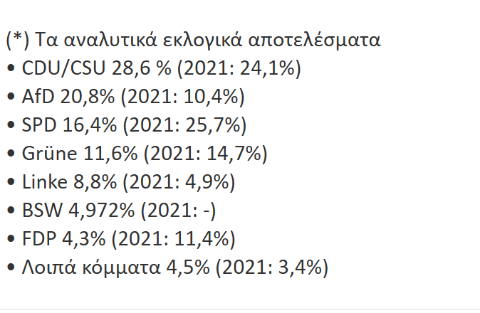 Οι εκλογές στη Γερμανία ανέδειξαν ξεκάθαρους νικητές τους Χριστιανοδημοκράτες (CDU/CSU) με 28,6%. Δεύτερο κόμμα είναι η “Εναλλακτική για τη Γερμανία” με 20,8%, το οποίο διπλασίασε τους ψήφους της σε σχέση με τις εκλογές του 2021. Τα κόμματα της περασμένης κυβέρνησης του “Φωτεινού Σηματοδότη” καταποντίστηκαν (SPD και FDP) ή μείωσαν αισθητά την εκλογική δύναμή τους (Πράσινοι). Στην πεντακομματική Βουλή δεν θα συμμετέχει το κόμμα της Σάρα Βάγκενκνεχτ (BSW) που με 4,972% δεν κατάφερε να μπει στη Βουλή, δηλαδή για 14.000 ψήφους σε σύνολο 49.927.315 ψηφοφόρων.