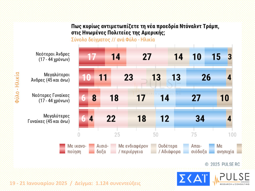 Η δημοσκόπηση που πραγματοποιήθηκε στο διάστημα 19 και 21 Ιανουαρίου – δηλαδή συνέπεσε με την ορκωμοσία του νέου προέδρου των ΗΠΑ και των πρώτων του ωρών στον Λευκό Οίκο – καταγράφει και τις πρώτες αντιδράσεις των πολιτών για την επιστροφή Τραμπ στην εξουσία: Ανεξαρτήτως κομμάτων, κυριαρχούν τα συναισθήματα της απαισιοδοξίας, της ανησυχίας, αλλά και της…περιέργειας, ενώ μόνον μεταξύ των ανδρών από 17 ως 44 χρόνων εκφράζεται σε υψηλό ποσοστό ικανοποίηση, αισιοδοξία και ενδιαφέρον.