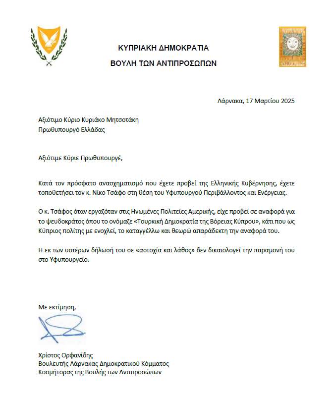Στην περίπτωση Τσάφου, όλα ξεκίνησαν από την επιστολή του Κύπριου βουλευτή του ΔΗ.ΚΟ, Χρίστου Ορφανίδη. Ο κ. Ορφανίδης υποστήριξε συμπερασματικά πως «η εκ των υστέρων δήλωσή του σε «αστοχία και λάθος» δεν δικαιολογεί την παραμονή του στο Υφυπουργείο.