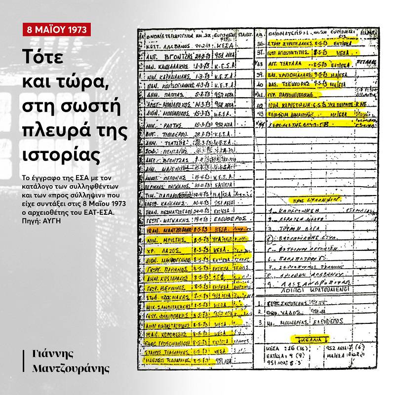 Σαράντα εννέα χρόνια συμπληρώνονται σήμερα από μια σημαντική, αλλά και όχι τόσο γνωστή σελίδα του αντιδικτατορικού φοιτητικού κινήματος. Ήταν ξημερώματα της 8ης Μαΐου 1973 όταν ένοπλοι ΕΣΑτζήδες συνέλαβαν ηγετικά στελέχη του αντιδικτατορικού φοιτητικού κινήματος και οργανώσεων.