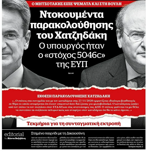 Ραγδαίες πολιτικές εξελίξεις προοιωνίζεται η νέα τροπή που παίρνει το σκάνδαλο των υποκλοπών, με την κυβέρνηση να βρίσκεται πλέον σε οριακό σημείο, αλλά και τη ΝΔ να ενόψει δύσκολων αποφάσεων. Όπως έχει προαναγγείλει ο εκδότης του “Documento” στην αυριανή έκδοση της εφημερίδας θα παρουσιάσει το πειστήριο που αποδεικνύει την νόμιμη παρακολούθηση του τότε υπουργού Ενέργειας και Περιβάλλοντος και νυν Εργασίας, Κωστή Χατζηδάκη.