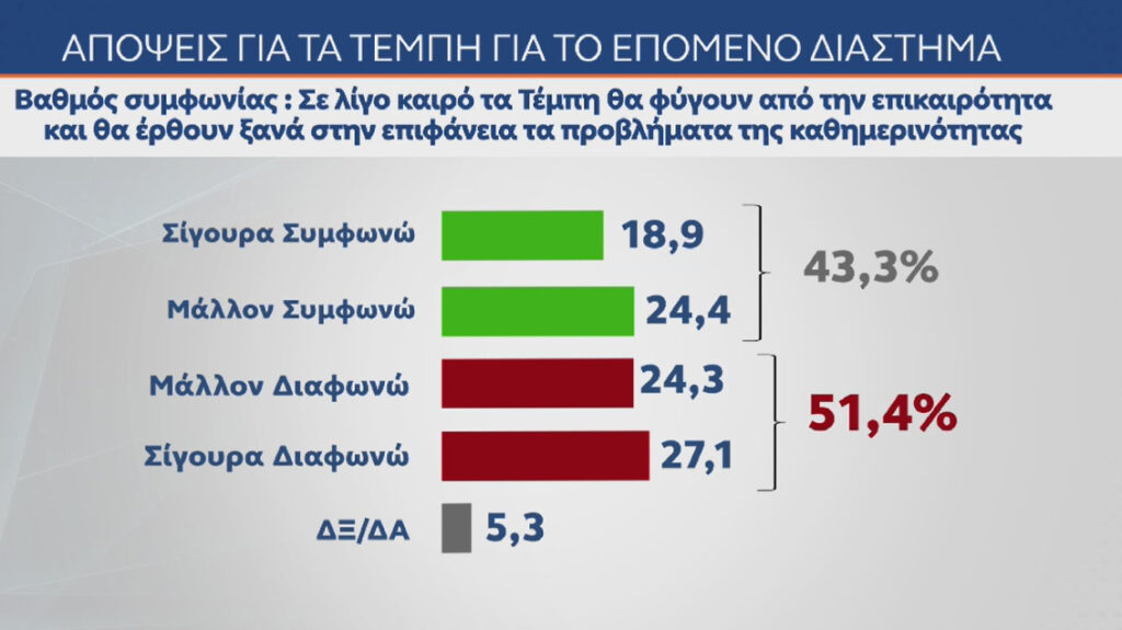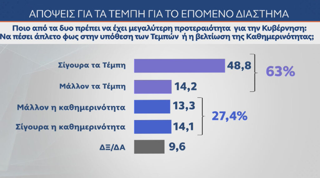 Εξαιρετικό ενδιαφέρον έχει το γεγονός ότι η συντριπτική πλειοψηφία των πολιτών δεν θεωρεί ότι η κυβέρνηση κάνει το καλύτερο δυνατό για να πέσει άπλετο φως στην υπόθεση των Τεμπών. «Σίγουρα όχι» απαντά το 62,9% και «μάλλον όχι» το 16,6% , ενώ «μάλλον ναι» απαντά το 10,8% και «σίγουρα ναι» μόλις το 8,5%.