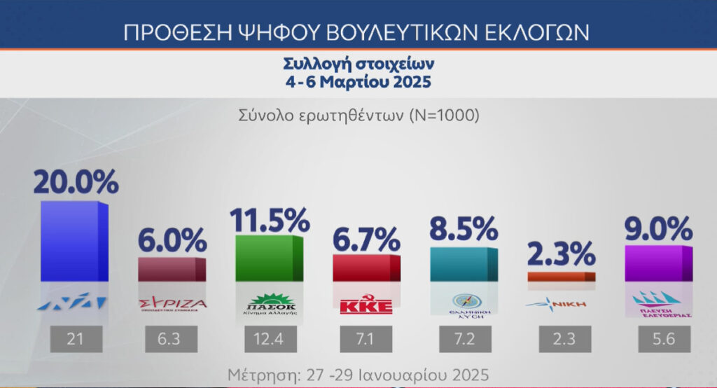Στην πρόθεση ψήφου, η δημοσκόπηση αποτυπώνει τα εξής ποσοστά: