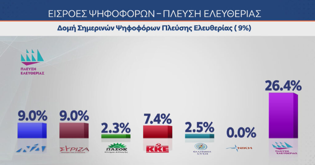 Όπως προκύπτει από τη δημοσκόπηση της MRB, η Πλεύση Ελευθερίας έχει έντονη εισροή ψηφοφόρων σε ποσοστό 9% τόσο από τον ΣΥΡΙΖΑ όσο και από τη ΝΔ.