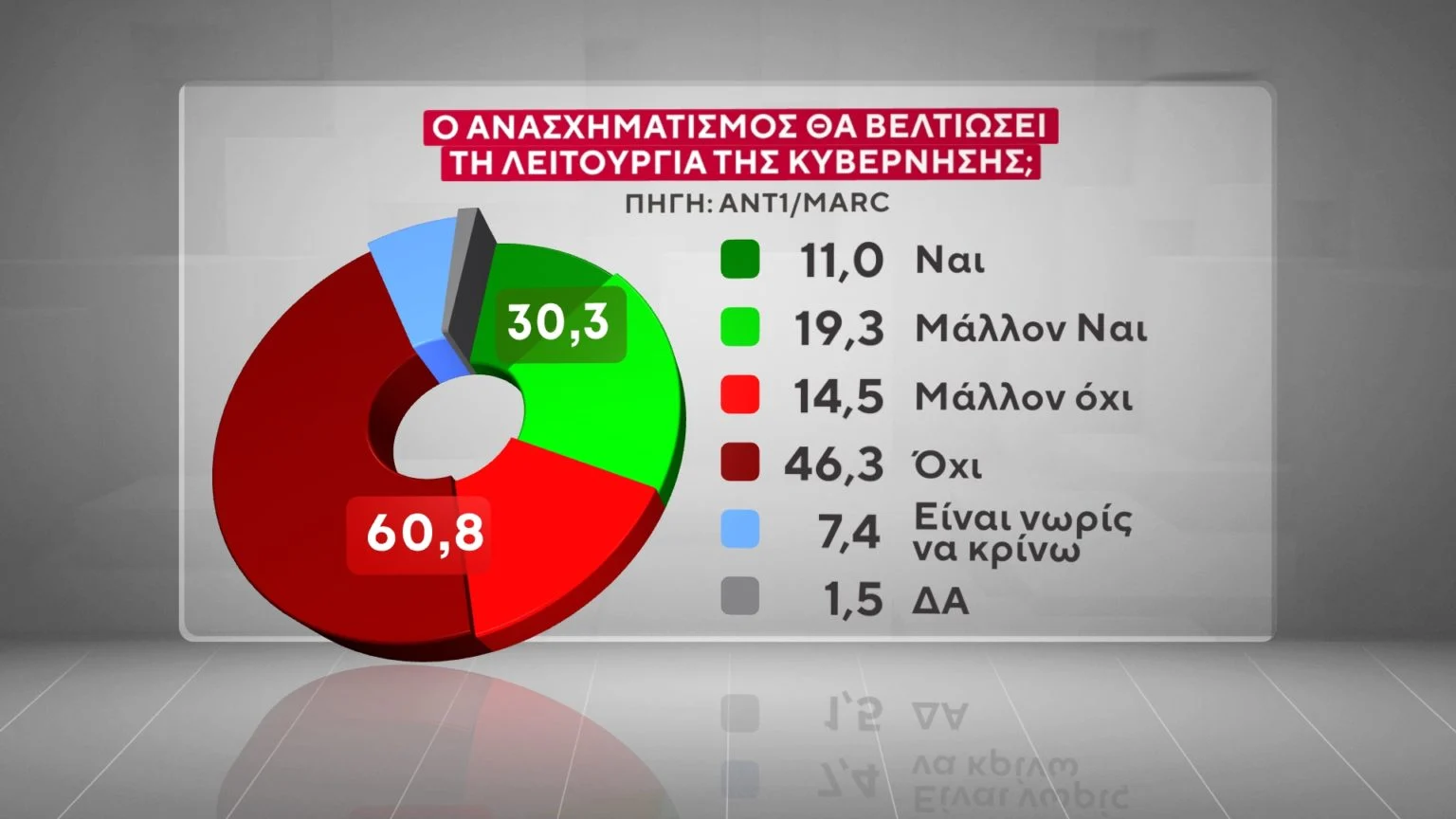 Σχετικά με τον εάν ο ανασχηματισμός θα βελτιώσει την λειτουργία της κυβέρνησης, σύμφωνα με τη δημοσκόπηση το 60,8% απάντησε ότι δεν πιστεύει ότι θα γίνει πιο αποτελεσματική η κυβέρνηση, ενώ το 30,3% απαντά θετικά και το 7,4% πως είναι ακόμη νωρίς για να κρίνει.