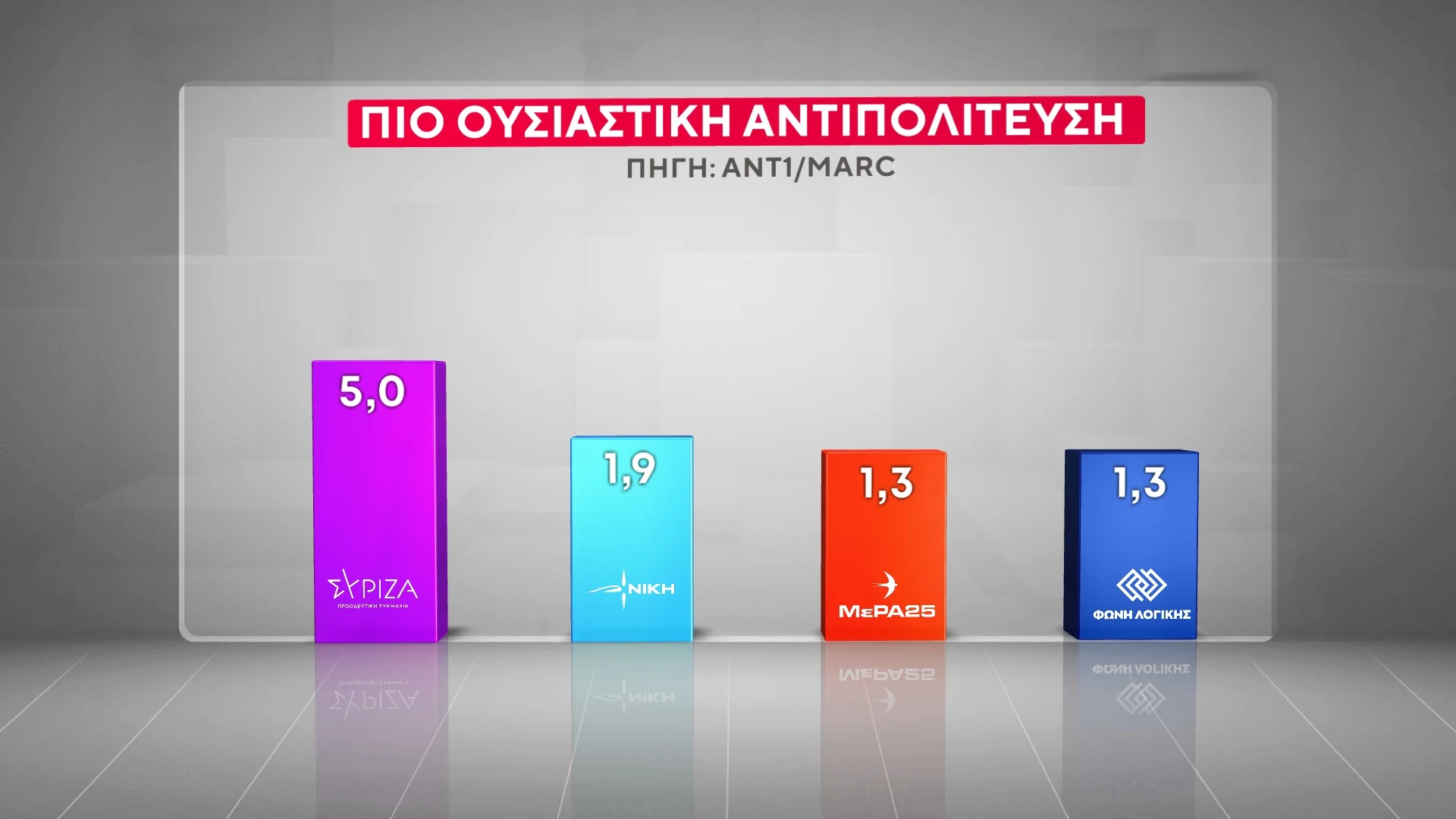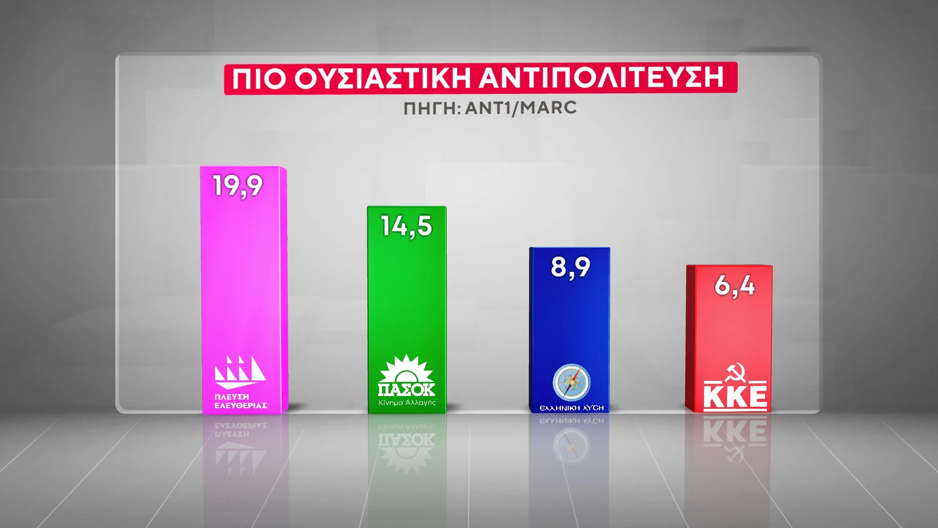 Αναφορικά με το ποιο κόμμα κάνει την πιο ουσιαστική, το 19,9% απαντά η «Πλεύση Ελευθερίας». Στη 2η θέση είναι το ΠΑΣΟΚ με ποσοστό 14,5% και στην τρίτη η «Ελληνική Λύση» με 8,9%. Ακολουθούν το ΚΚΕ με 6,4% και ο ΣΥΡΙΖΑ με 5%.